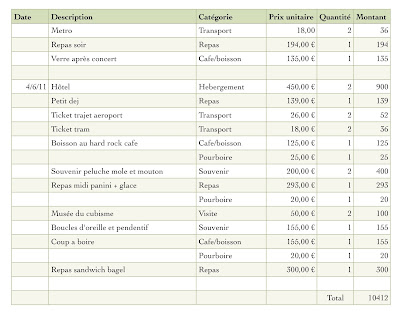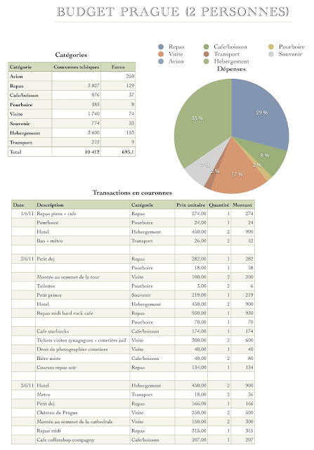 Voilà une idée de ce que peux couter un week end à Prague, nous avons essayé de noter au fur et à mesure et divisé les différentes dépenses en rubriques. Les couleurs ne sont pas très lisibles mais avec un Ipad sous Numbers, nous n’avons pas encore trouvé comment choisir les couleurs !!