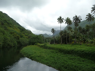 Comme il pleut beaucoup plus sur Taravao qu’ailleurs, (ça c’est apparemment lié à l’orientation des montagnes), le temps est couvert, on décide donc de commencer à prendre la côte est, pour s’éloigner un peu; On espère trouver un coin plus ensoleillé pour la pause casse-croute…