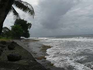 Comme il pleut beaucoup plus sur Taravao qu’ailleurs, (ça c’est apparemment lié à l’orientation des montagnes), le temps est couvert, on décide donc de commencer à prendre la côte est, pour s’éloigner un peu; On espère trouver un coin plus ensoleillé pour la pause casse-croute…