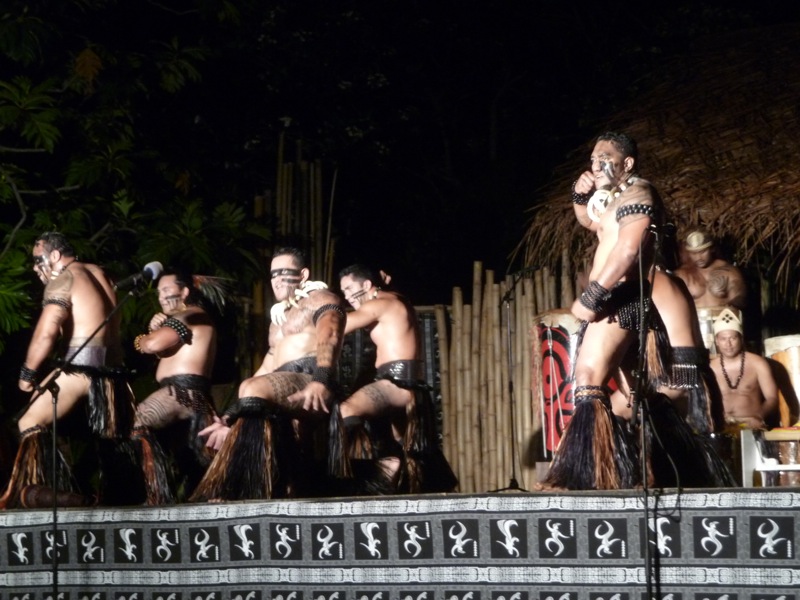 Commençons par le spectacle de danse traditionnelle, le haka, cette danse est devenue célèbre avec la mythique équipe de rugby néo-zélandaise, les All Blacks, mais elle est ancrée dans la culture maori depuis très….très… longtemps. Cette danse est une coutume importante, particulièrement au moment de souhaiter la bienvenue lors de rencontres sociales.