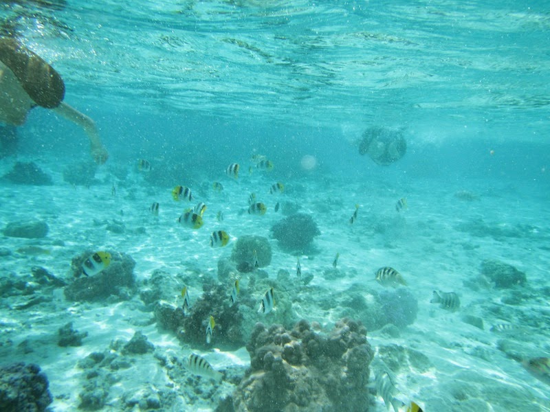 On marche un peu le long du motu pour remonter en haut du jardin de corail, puis on se met à l’eau et on se fait porter par le courant…gare au corail!