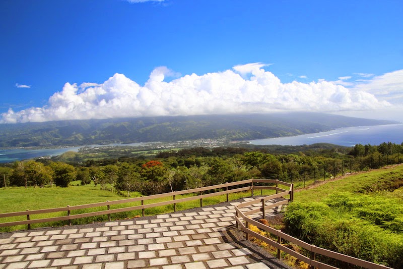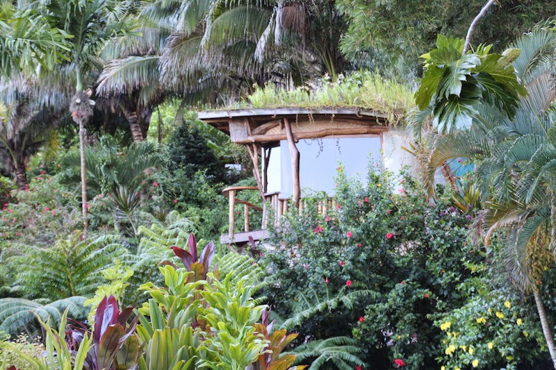 Nous arrivons dans la pension que nous avons réservé, sur les hauteurs de Teahupoo, avec une petite vue sur l’île de Tahiti nui (“nui” pour “grand” car ici nous sommes sur Tahiti iti : “petit”). Au bout d’un petit chemin qui monte… monte… monte, nous arrivons dans un endroit très bien aménagé, pelouse verte, jardin arboré et des bungalows cachés au milieu des arbres !!