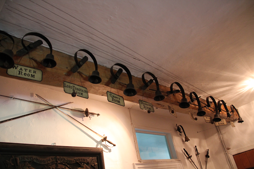 Dans les particularités il y a aussi le système de câbles et de cloches qui permettait aux servantes de savoir qui les appelait, et aux seigneurs de ne pas se déplacer!!