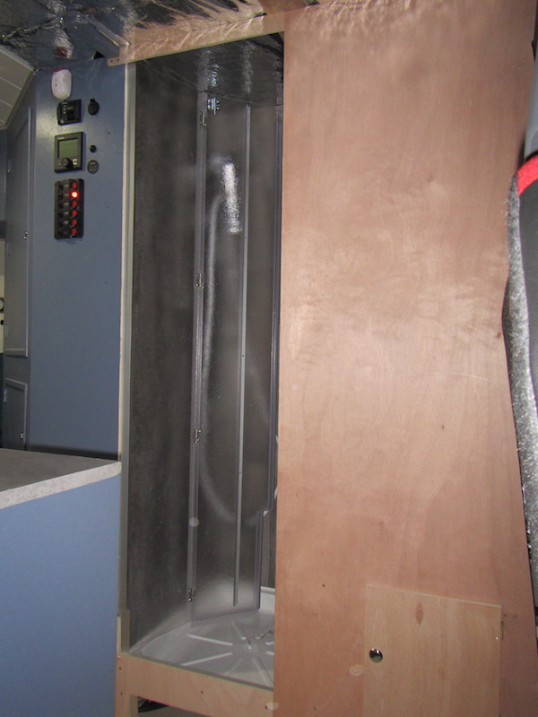 Ca y est, nous avons trouvé une solution pour fermer notre douche, une petite porte faite sur-mesure, pouvant se plier en deux pour s’ouvrir (ben oui, nous n’avons pas beaucoup de place!) et normalement hermétique!
