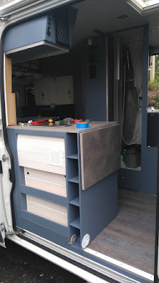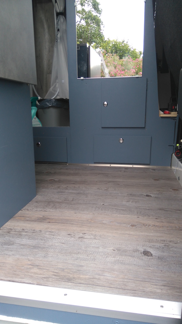Après tout ça, il faut avancer encore des petites choses à l’intérieur, de la peinture par exemple et le lino dans le placard sous la banquette (coin salon),