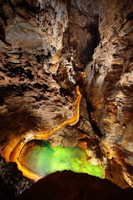 Nous prenons finalement le chemin de la descente infernale !! Le puits d’entrée est profond de 75m et il faut encore descendre pour arriver à 103m sous la surface, au niveau de la rivière souterraine… Il ne faut pas moins de 543 marches pour arriver tout en bas.