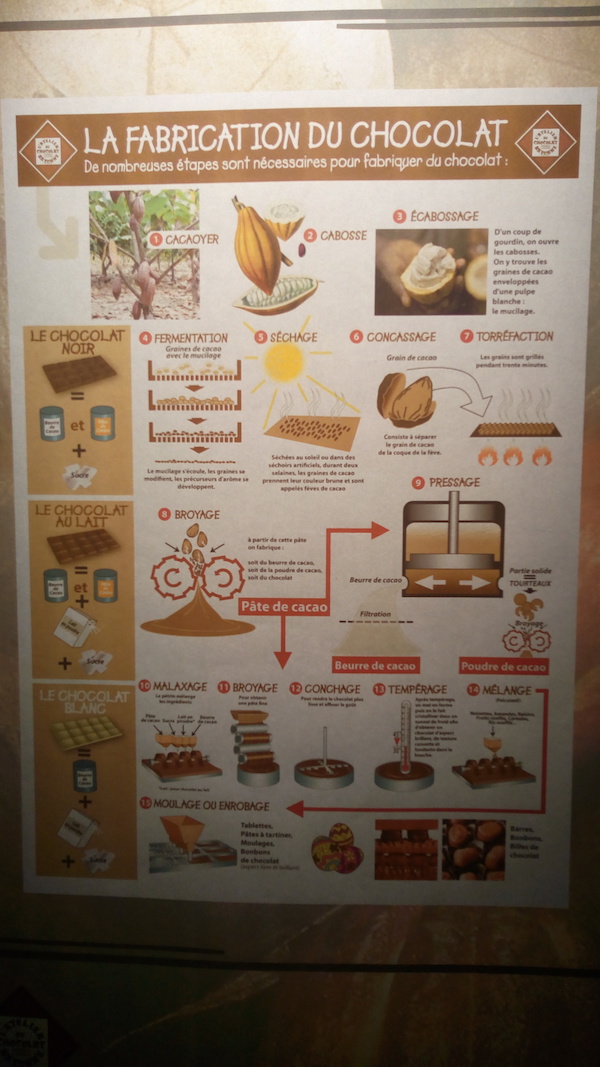 Pour revenir à la visite, en avançant dans l’exposition, on passe devant des salles vitrées où l’on peut observer des chocolatiers en pleine action! (Solivann a trouvé cette partie là plus intéressante!!).