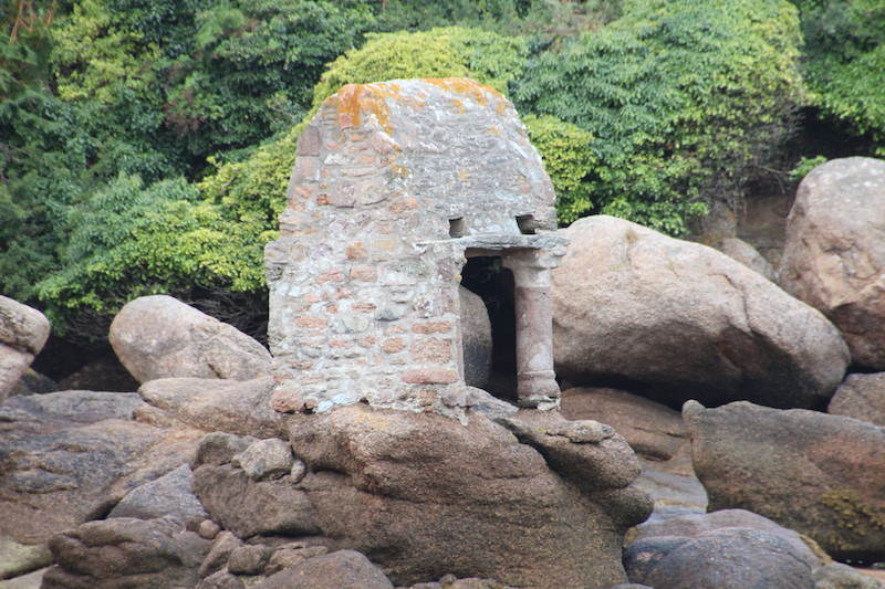 Nous en profitons pour photographier l’oratoire de Saint-Guirec, construit au XII°siècle à la mémoire de ce Saint. Il est accessible à marée basse seulement et entourée d’eau à marée haute!