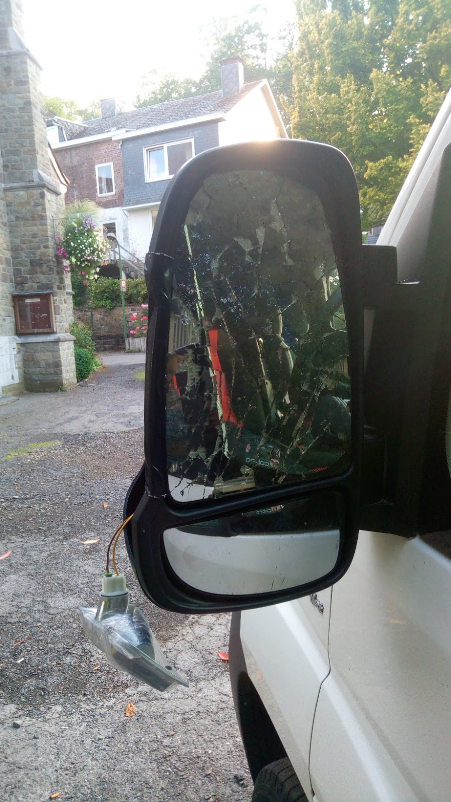 Puis, sur une route relativement étroite (conseillée par notre GPS…), nous avons croisé un petit camion avec des rétroviseurs à la même hauteur que les nôtres… Et paf ! On ne rit pas 😋