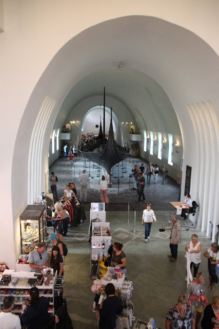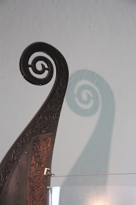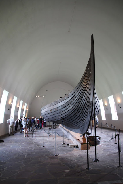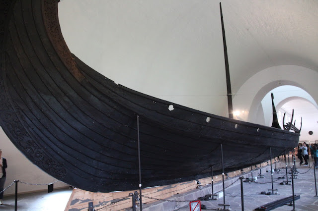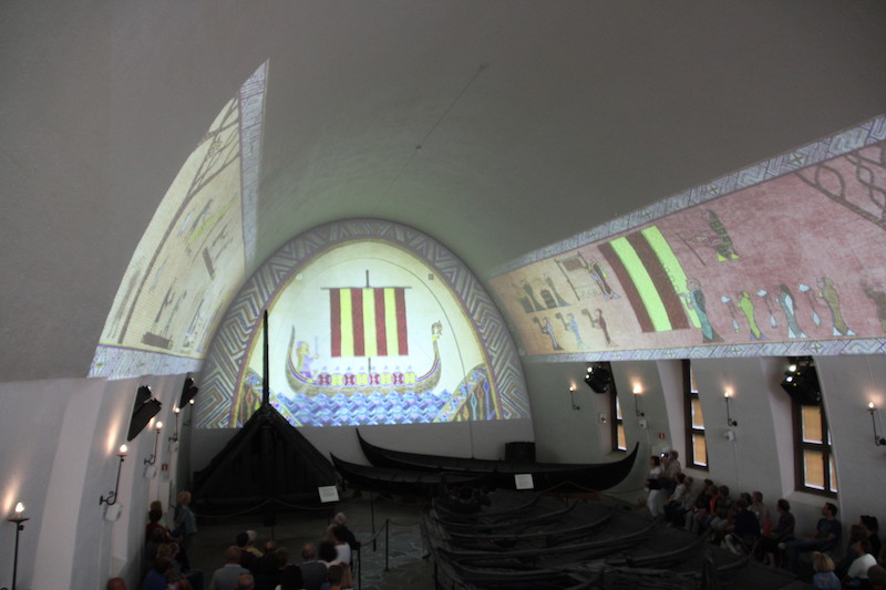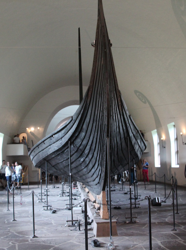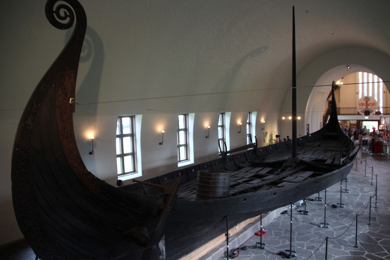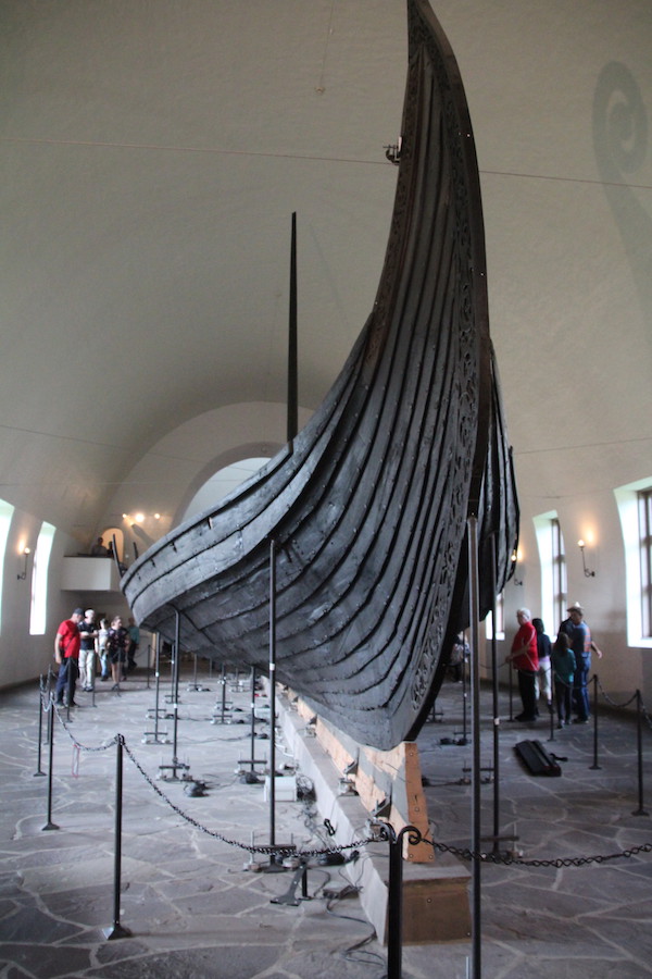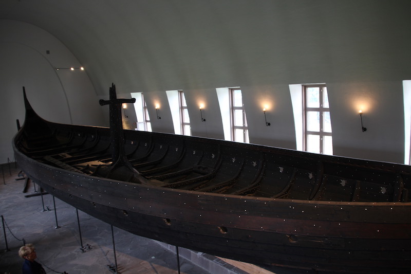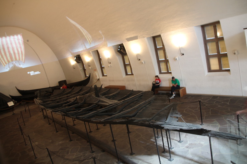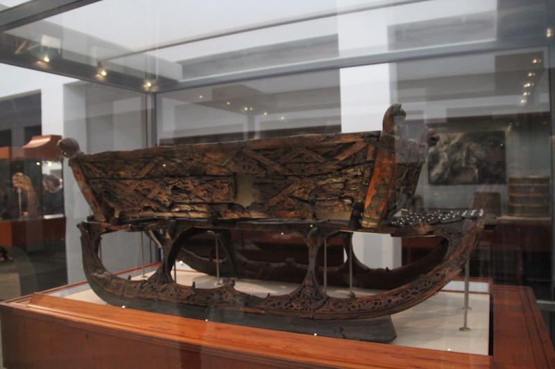 Les 3 bateaux vikings de ce musée sont les seuls retrouvés en Norvège, à peu près complets. Pourquoi? Parce qu’on les a trouvés enterrés dans le sol argileux (et non pas dans l’eau)…et pourquoi?… parce que à l’époque, il y a plus de 1000 ans, ils étaient utilisés pour les funérailles… et pourquoi?…parce que la tradition était alors de sortir le bateau de l’eau, de mettre le défunt dedans (avec au passage son chien et son cheval… ) ainsi que tout le mobilier funéraire de l’époque… Comprenez par là : chambres funéraires, petites barques, chariots funéraires, coffres, chaussures de cuir, outils agraires, tissus, objets usuels, bijoux…