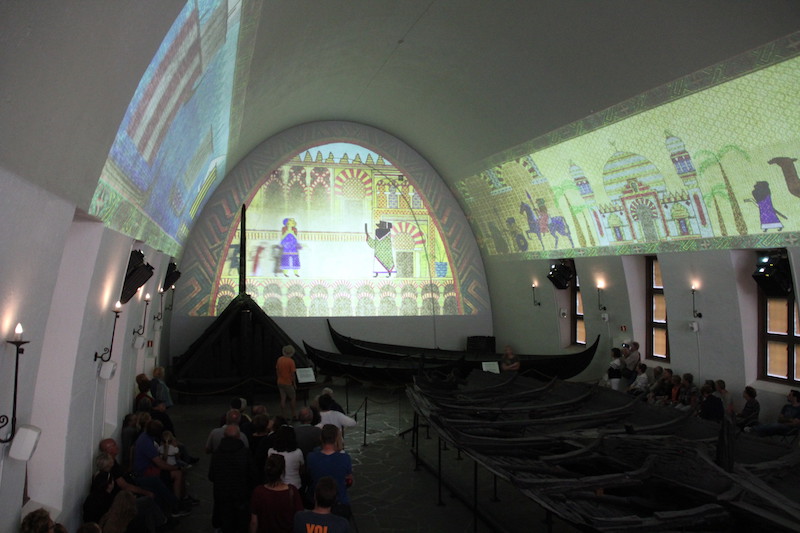 Pour terminer la visite, un chouette petit film (qui se lance toutes les 15 minutes) contant l’aventure viking, est projeté directement sur les murs et le plafond de la salle du drakkar n°3 (Tune).