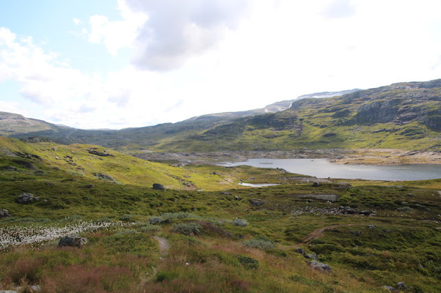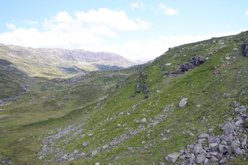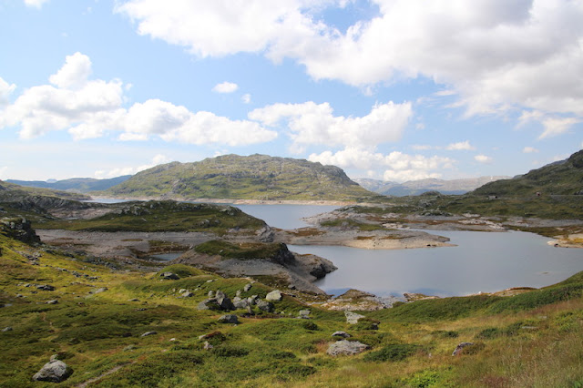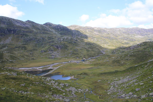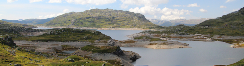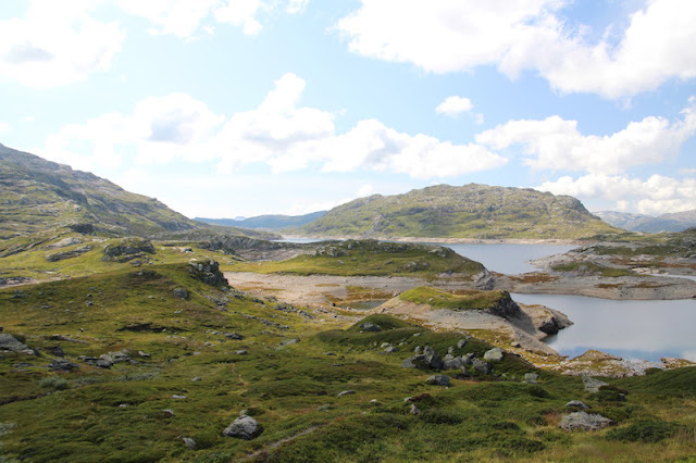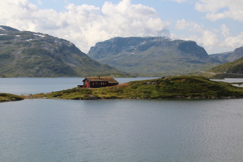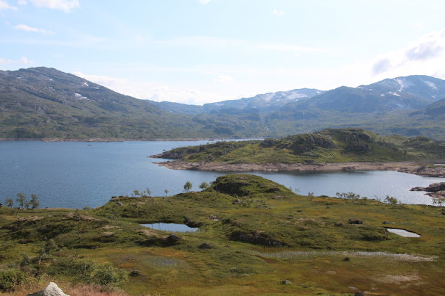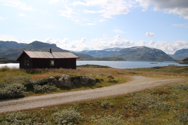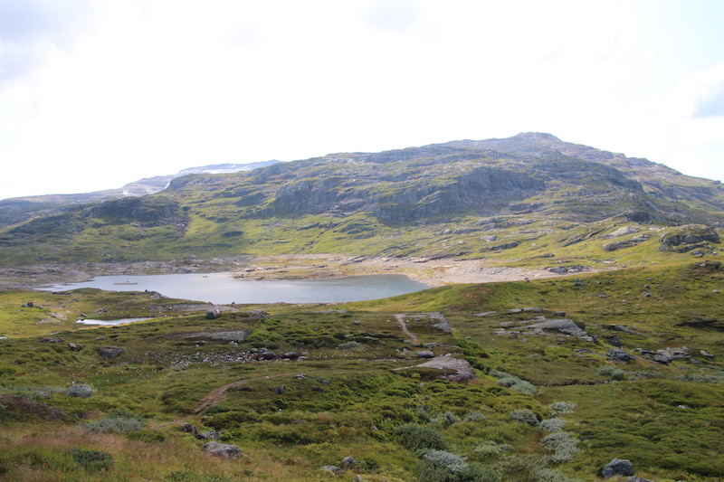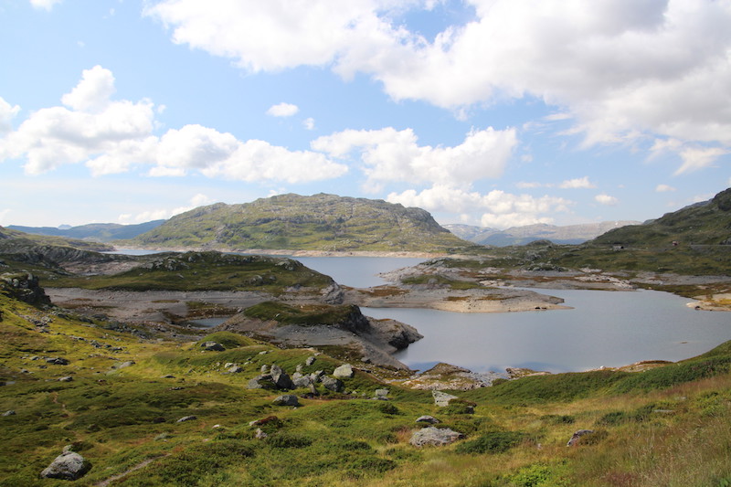 Nous empruntons la route E134 qui monte un peu en hauteur et qui longe le plateau du Hardangervidda. Ici les crêtes culminent à 1700m, il y a de très jolis petits lacs, c’est vraiment très très beau.