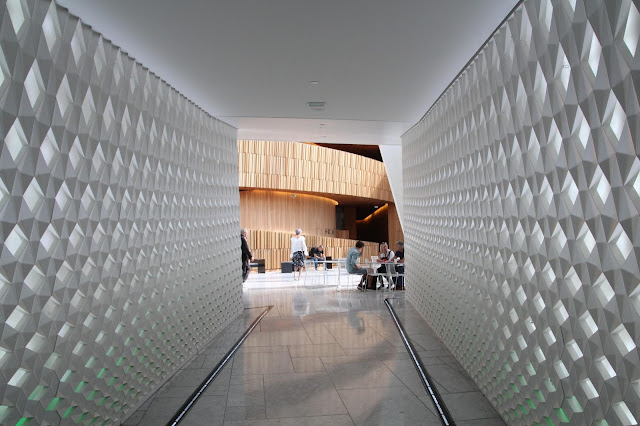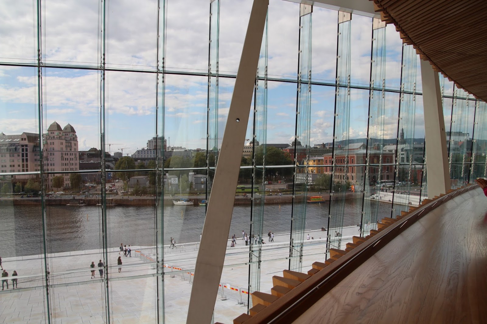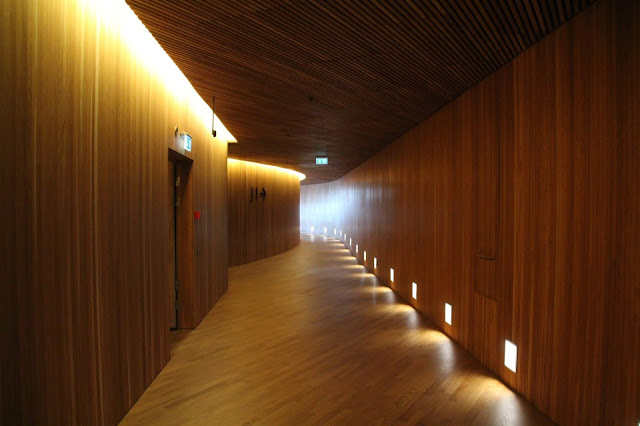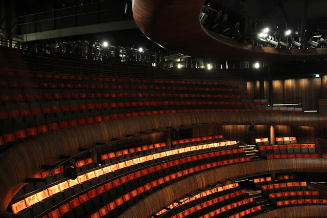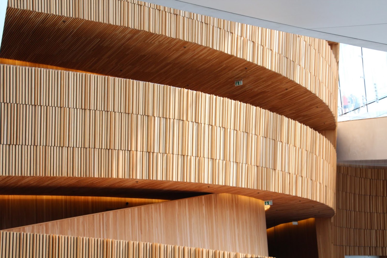 L’intérieur est comme un gros bloc en bois dans lequel les salles de spectacles sont construites. Ce matériau a essentiellement été choisi pour ses qualités acoustiques et ses possibilités de mise en forme pour que le son se propage correctement dans les salles même sans sonorisation. (l’entreprise qui a participé à l’élaboration des salles est la même que pour l’opéra de Sydney : Ave Arup.)