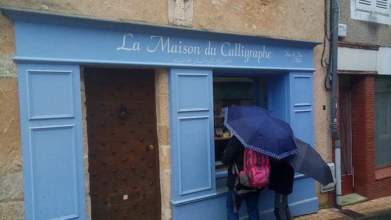 Nous redescendons au hasard des ruelles, il y a beaucoup de petits commerces et d’artisans, super pour les amateurs de lecture, d’écriture et d’arts… Il nous faudra revenir pour découvrir ce côté là de Montmorillon, pour aujourd’hui nous nous contentons d’observer les jolies vitrines, l’occasion par exemple de découvrir l’art de la calligraphie… Solivann, grand fan de plumes… est ravi! 😉