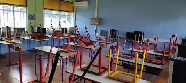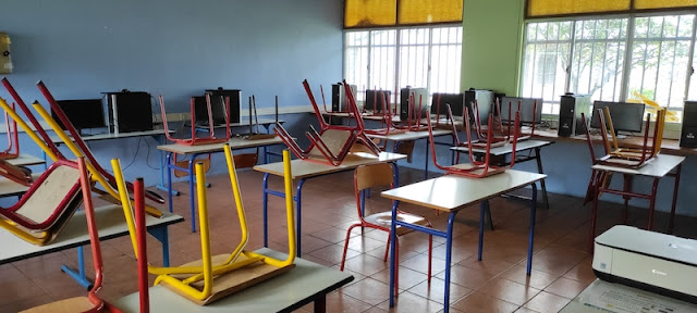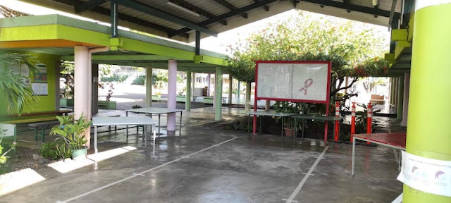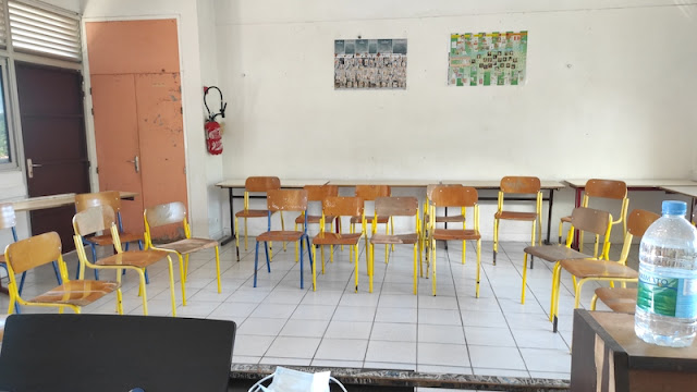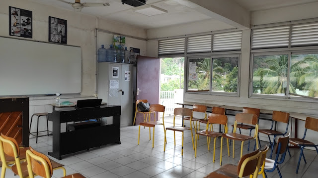 On essaye d’éviter le brassage des élèves, alors au collège il y a un sens de “circulation” pour aller en classe, on monte côté montagne et on descend côté mer… (on vous laisse imaginer le premier jour où il a fallu chercher le bon sens… mais bon sang, elle est où la mer???! 😂😂)